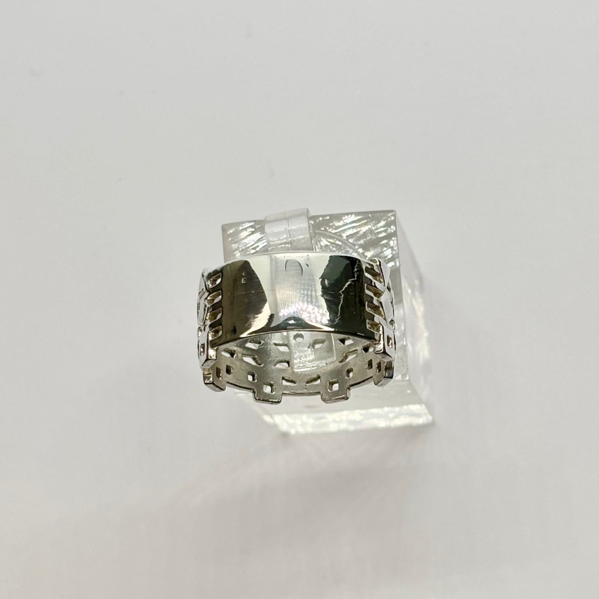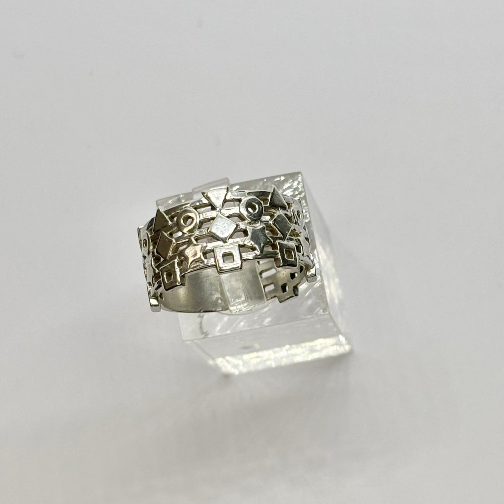 Add a touch of whimsy to your style with this sterling silver ring, waxed and cast to perfection. Featuring a playful pattern of circles, squares, stars, and triangles, it’s a fun way to express your unique vibe. Sized at P and priced at £29.99, this ring is ready to brighten up any outfit with its charming geometric flair.